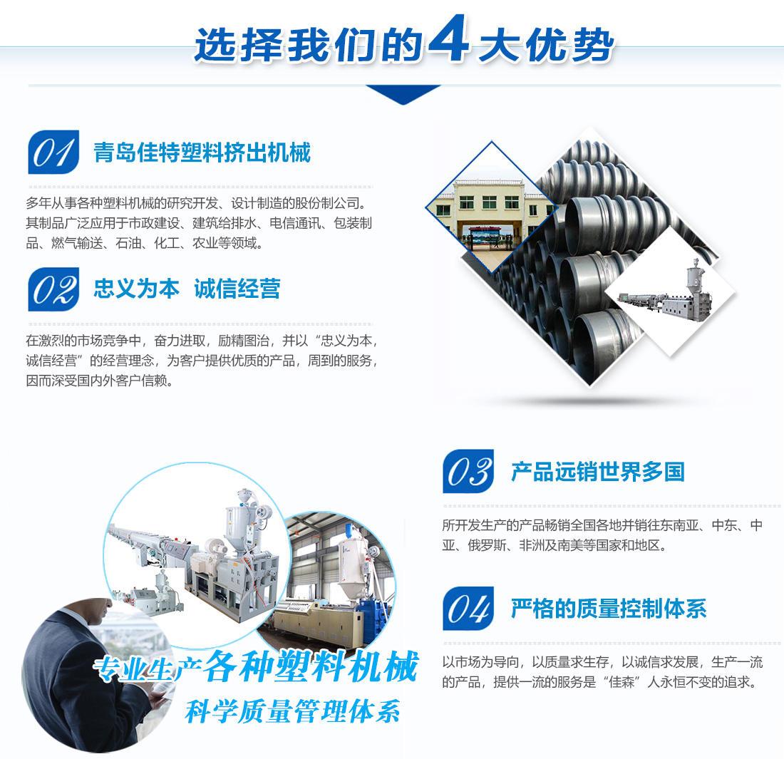 青島佳特塑料擠出機(jī)械有限公司是多年從事各種塑料機(jī)械的研究開發(fā)、設(shè)計制造的股份制公司。公司主導(dǎo)產(chǎn)品:PP、PE鈣塑格子板生產(chǎn)線,大口徑雙重壁纏繞管生產(chǎn)線,U-PVC、C-PVC管材生產(chǎn)線,PP、PE、PPR、PPB供水燃?xì)夤懿纳a(chǎn)線、硅芯管生產(chǎn)線、鋁塑、鋼塑、銅塑管、尼龍棒、尼龍管生產(chǎn)線,PVC、PE、PP波紋管生產(chǎn)線,單雙向土工格柵生產(chǎn)線,木塑板材生產(chǎn)線,PVC、PP、PE片材、板材生產(chǎn)線,PET打包帶生產(chǎn)線,其制品廣泛應(yīng)用于市政建設(shè)、建筑給排水、電信通訊、包裝制品、燃?xì)廨斔汀⑹汀⒒ぁ⑥r(nóng)業(yè)等領(lǐng)域。 [查看更多]
